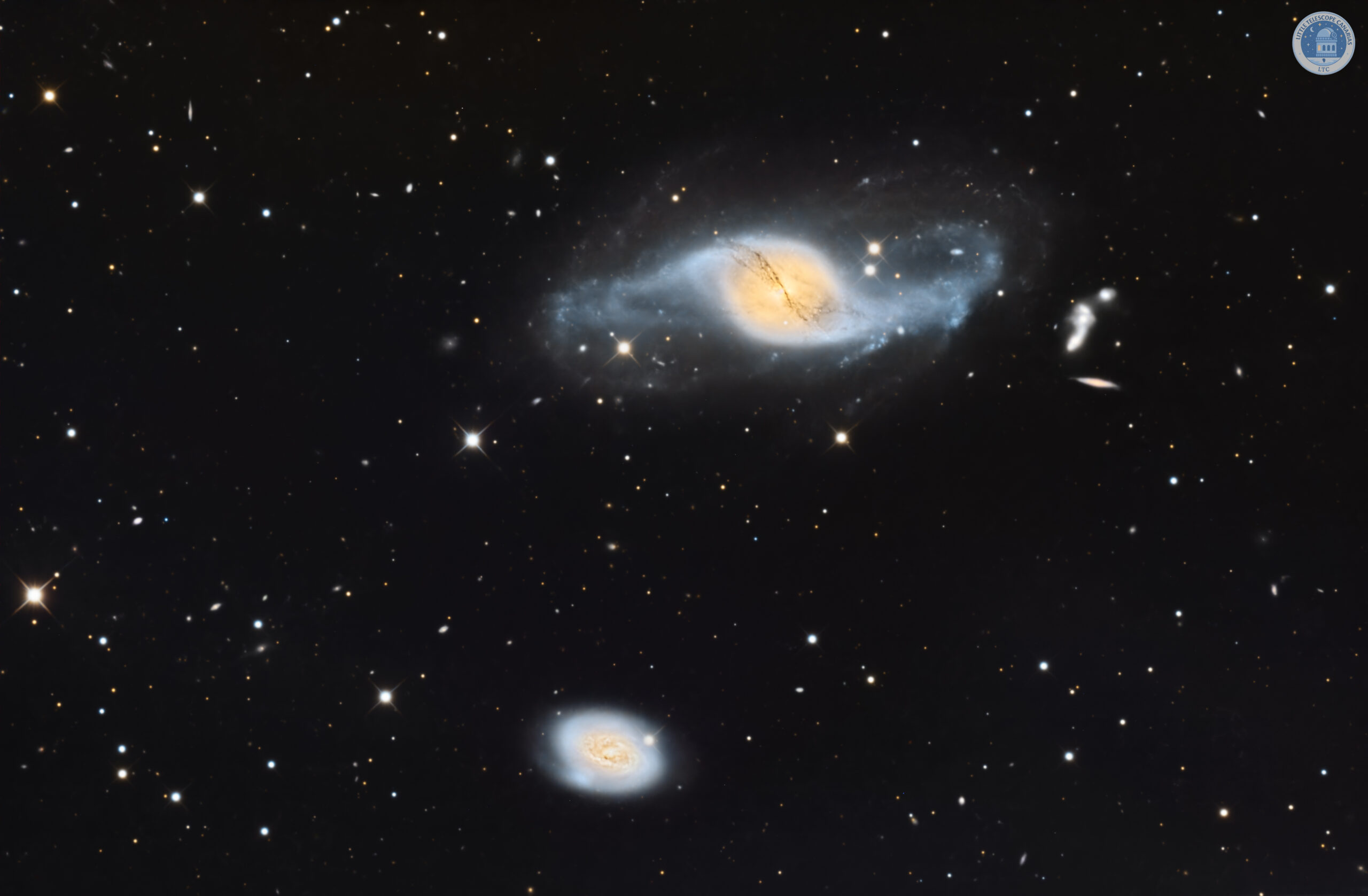 El objeto principal corresponde a la galaxia NGC 3718, acompañada por su vecina NGC 3729, formando un sistema donde la interacción gravitatoria ha generado estructuras complejas y deformadas.