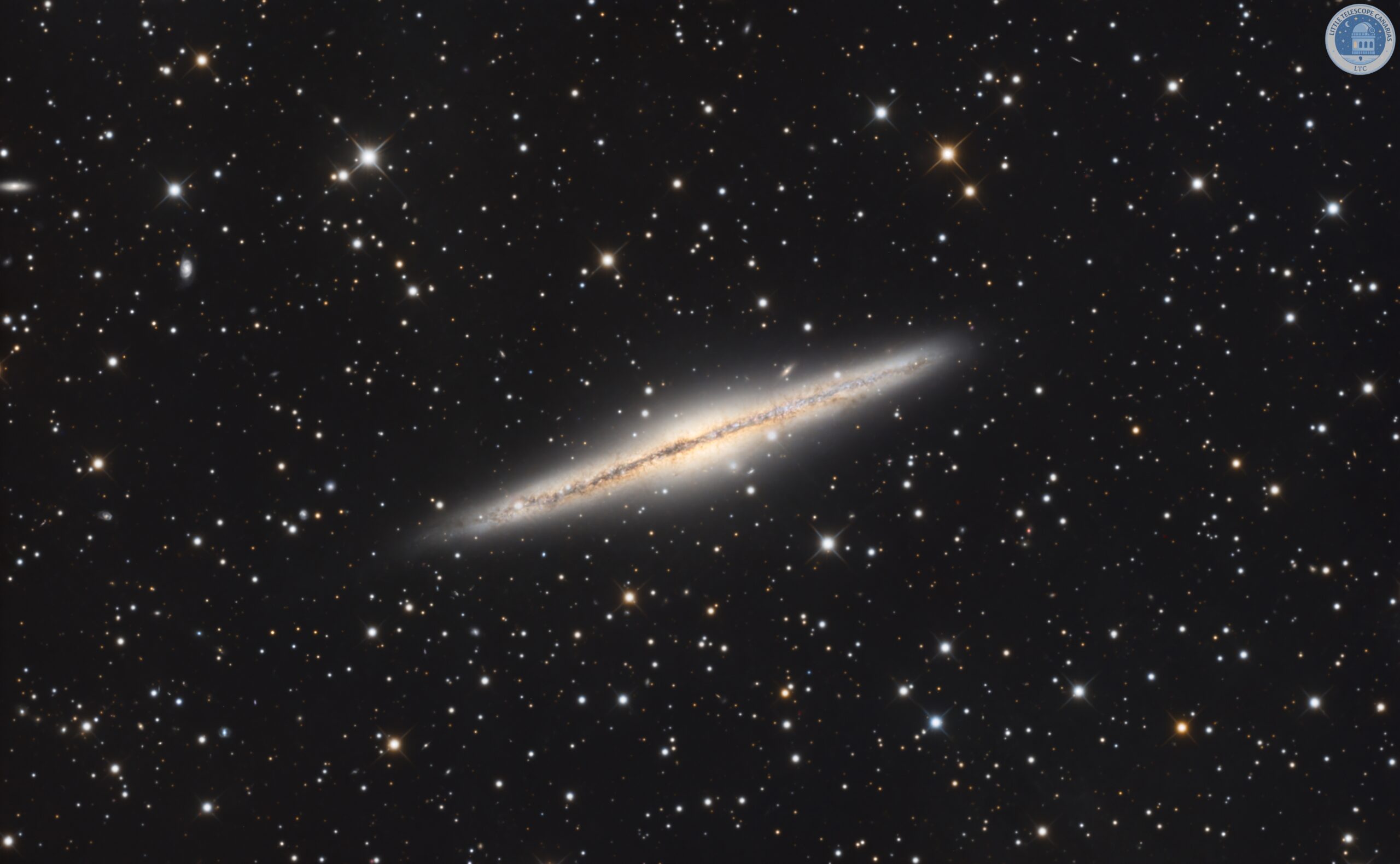 Su orientación casi exactamente de canto convierte a NGC 891 en un objeto excepcional para estudiar la anatomía vertical de una galaxia espiral.